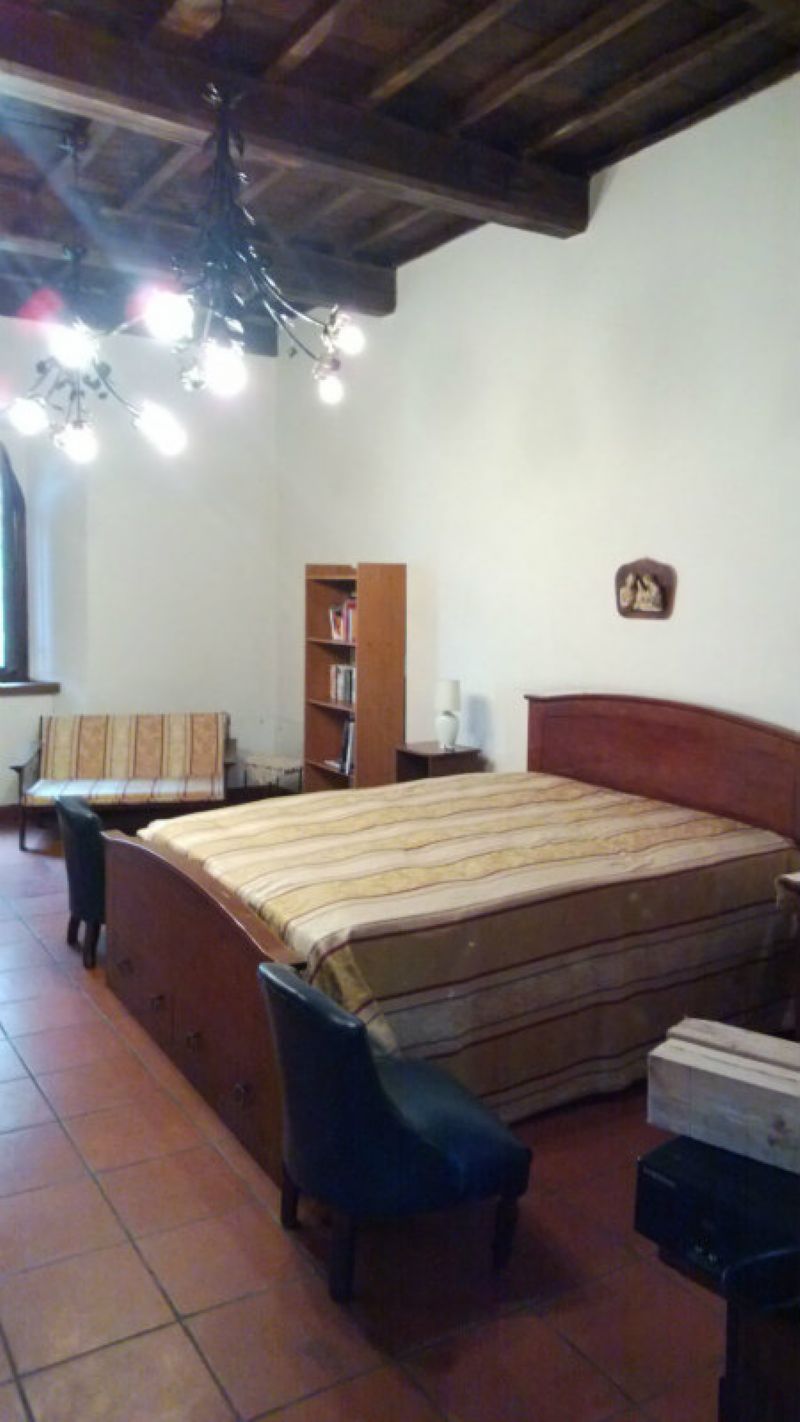 (104 netti) su un unico livello occupante un'intera ala di un antico palazzo , legnaia e cantina, oltre ad aree e spazi di passaggio comuni recintati. Attualmente è in buone condizioni, abitabile, con necessità solo di alcuni interventi di rinnovamento ed ottimizzazione. Un antico ingresso immette in un piccolo luminoso atrio comune con il portoncino originale dell'appartamento. All'interno si incontra subito una sala da pranzo con peculiare camino e finestra sul cortile. Collegati alla sala da pranzo due piccoli vani che ospitano la cucina ed una scala con passaggio verso la soffitta. Un corridoio immette nel resto dell'appartamento dove si succedono un ampio bagno, una camera da letto con finestra panoramica, un grande soggiorno ugualmente con finestra verso valle, un disimpegno con finestra e la grande camera da letto principale con tre finestre che offrono splendido panorama dell'abitato sottostante, della valle e del cortile interno. Cantina e legnaia di ampia superficie sotto l'appartamento si raggiungono attualmente dall'esterno attraverso un antico passaggio privato condiviso e in parte voltato, impreziosito da strutture originali e manufatti d'epoca. Legnaia e cantina hanno bisogno di alcuni interventi di messa a punto potendo anche prevedere un eventuale collegamento interno diretto con l'appartamento superiore. Lo spazio comune esterno recintato, oltre al portico, comprende una ampia corte su cui si affacciano antichi palazzi e superfici alberate. Il tetto della casa è in buone condizioni recentemente revisionato, il riscaldamento è autonomo con termoconvettori a gas metano, acqua calda sanitaria garantita da piccola caldaia a gas. Le finestre sono in parte originali in legno di castagno ed in parte nuove in pvc anche con persiane. Le porte interne sono per lo più antiche in legno di castagno. I pavimenti di alcune stanze sono originali in splendide mattonelle antiche di cotto, altre stanze hanno pavimento nuovo in cotto. Il soggiorno e la grande camera da letto presentano soffitti originali in legno a cassettoni a vista. Parcheggio a breve distanza. Nota il prezzo di vendita include gran parte dell'arredamento e del.
