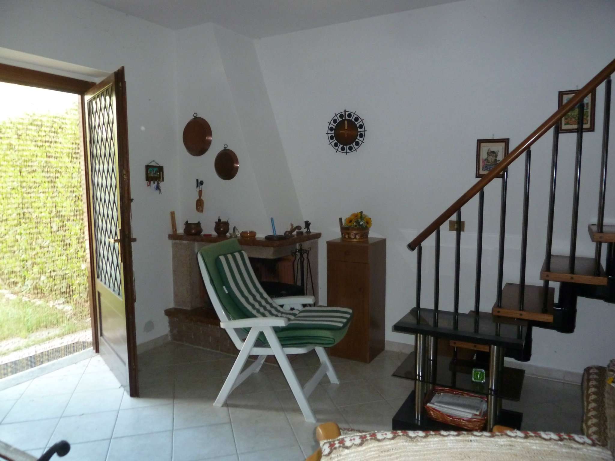 vende a rocca di botte villetta a schiera con piccolo giardino con casetta in legno rimesso attrezzi su due livelli composta di soggiorno con angolo cottura e camino piano primo due camerette e bagno arredata con riscaldamento autonomo a metano posto auto esterno.