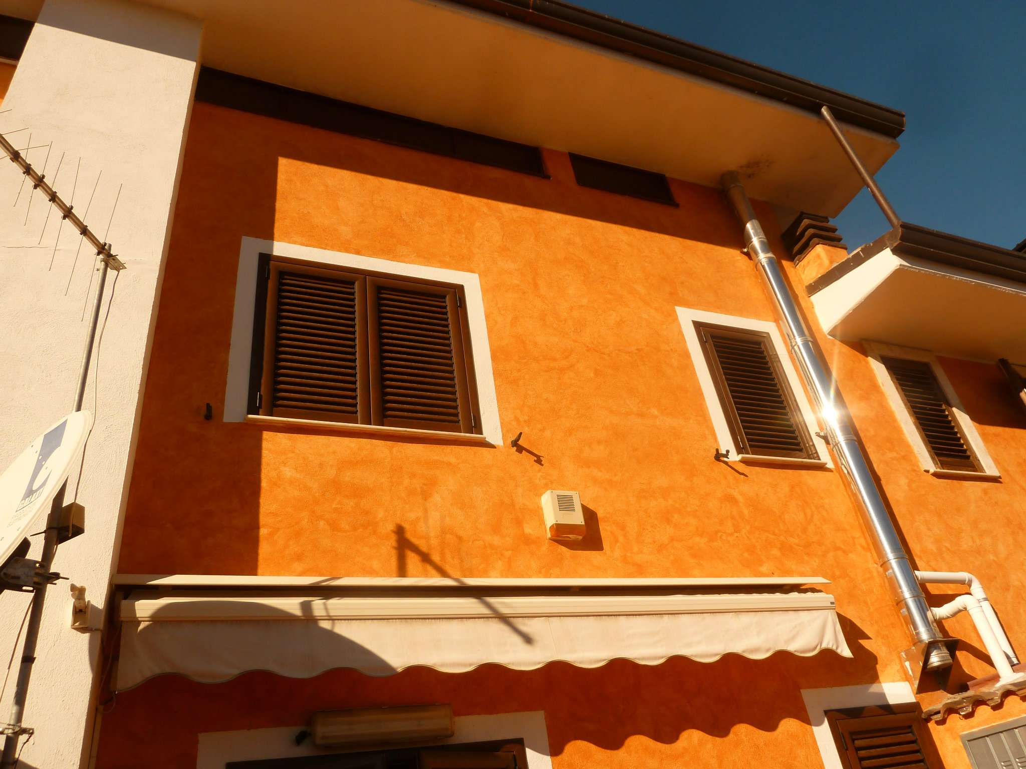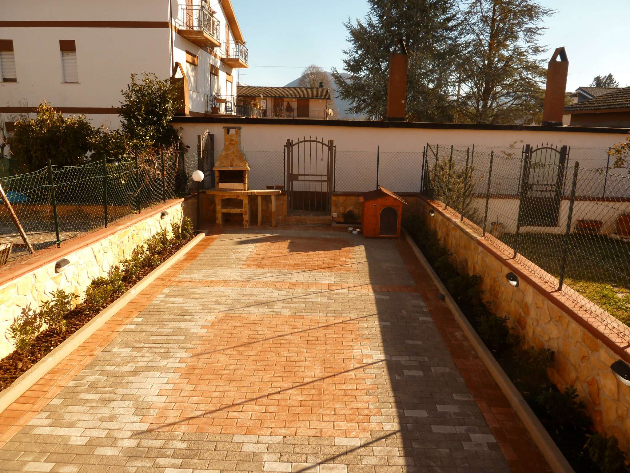 oricola vende villa in quadrifamiliare con giardino esclusivo su tre livelli oltre garage cantina locale idrico piano terra viale d'entrata con soggiorno bagno cucina abitabile terrazzo vivibile con accesso dalla cucina e giardino piano primo tre camere da letto con bagno e balcone piano secondo camera con bagno completa la proprieta' una sala hobby attrezzata situata nel pinao seminterato con forno a legna camino cucina attrezzata e bagno ottimo stato doppio riscaldamento autonomo pellets e caldaia metano - Classe: G.