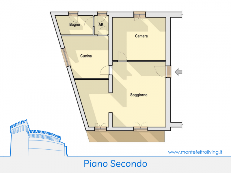 L'accesso all'appartamento avviene da portone comune affacciato su un piccolo piazzale posto verso la strada provinciale e separato da essa da un camminamento pedonale. Risalendo il vano scala interno ad uso condiviso si raggiunge al piano secondo il pianerottolo che conduce all'unità. L'ingresso si apre su un ampio e luminoso open space caratterizzato dalla presenza di un balcone sul fronte e di una seconda stanza adiacente raggiungibile da un'apertura arcata. Accanto alla zona giorno, ma separata da essa, troviamo la cucina con bagno e antibagno. Accanto al soggiorno anche un'ampia camera da letto con finestra affacciata sul retro dell'abitazione. All'interno della proprietà anche un vano sottotetto ad uso soffitta e un magazzino posto al piano terra ed accessibile direttamente dall'esterno. La proprietà si trova in buone condizioni di manutenzione, non necessita di lavori straordinari ed è fin da subito abitabile. --- annuncio pubblicato con GESTIONALEIMMOBILIARE.it.