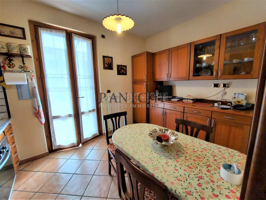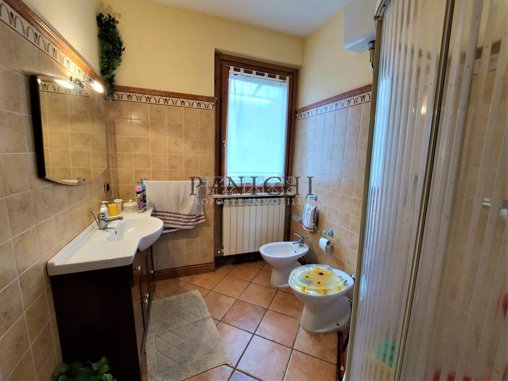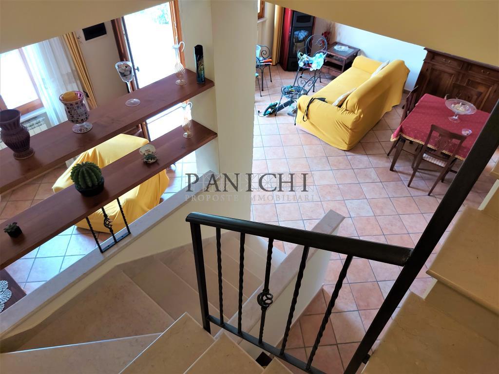 All'appartamento si accede da vialetto esclusivo ed è composto al piano terra da ingresso, soggiorno pranzo, cucina con terrazzo, bagno, scala di collegamento col piano primo composto da n° 3 camere tutte con terrazzo, cabina armadio, bagno e collegamento col piano mansardato sottotetto. Al piano seminterrato collegato da scala interna si trova il garage, con rispostiglio, locale tecnico e cantina. L'appartamento ha diverse dotazioni ed in particolare stufa a pellet collegata con l'impianto di riscaldamento con caldaia a condensazione, pannello fotovoltaico di 3 Kw con incentivi annuali di circa 1.600 euro fino al 2030, sistema di irrigazione del giardino con pozzo, cancello elettrico per l'accesso al piazzale del garage in comune con altre 2 unità abitative, predisposizione per impianto di allarme, vetrate artistiche delle 2 porte scorrevoli della cucina, piano sottotetto completamente rifinito e citofono intercomunicante tra i piani dell'appartamento. L'arredamento presente viene lasciato, ad eccezione del mobilio del soggiorno in legno massello, che viene trattato a parte se di interesse. Ottima soluzione per famiglie numerose che necessitano di ampi spazi sia interni che esterni. Si informa che l'indirizzo in annuncio non è quello esatto per motivi di privacy. Se vuoi ricevere maggiori informazioni o fissare una visita per questa prorpietà contattaci al +39 3760410559 oppure inviaci una mail a info@panichiimmobiliare.it Sul nostro sito www.panichiimmobiliare.it puoi trovare altre proposte interessanti e tutti i servizi che offre la nostra immobiliare..