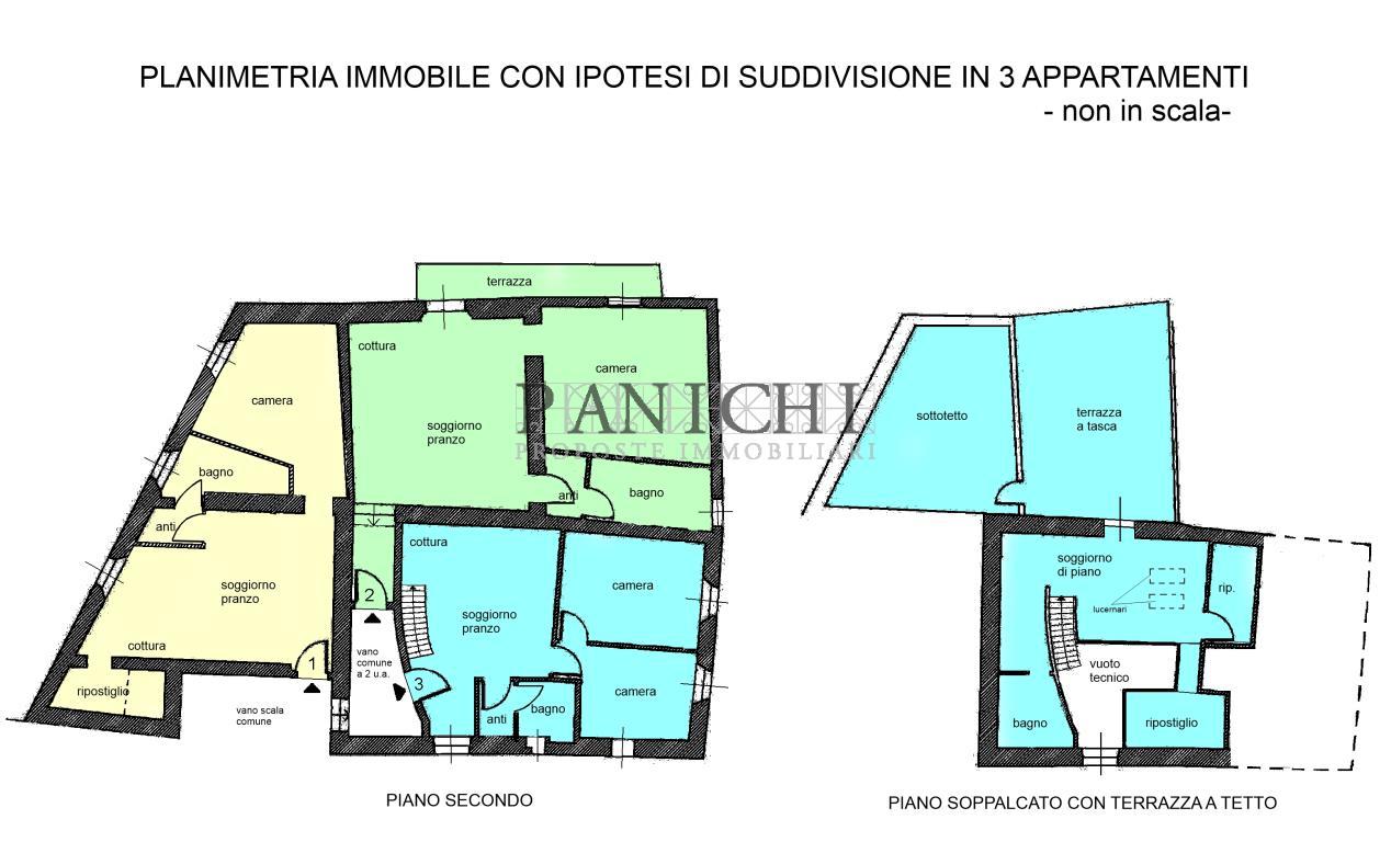 L'altro immobile è composto da ampio locale di 58 mq che può essere soppalcato e convertito in appartamento. E' possibile ristrutturare i 2 immobili con l'attuale divisione oppure ristrutturarli scegliendo una suddivisione che va ad aumentare il numero degli appartamenti come da planimetria allegata, potendo sfruttare al massimo la superficie calpestabile e la volumetria, ricavando così 3 appartamenti di cui uno di 50 mq con soggiorno/pranzo, ripostiglio, camera e bagno. Un secondo appartamento di 60 mq. con soggiorno/pranzo, terrazzo, camera matrimoniale e bagno. Un terzo appartamento di 78 mq. su 2 livelli e predisposto per soggiorno/pranzo, 2 camere e bagno, scala di collegamento col soppalco predisposto per soggiorno di piano, bagno, 2 ripostigli e terrazza a tasca sul tetto da dove si accede al ripostiglio sottotetto. La proprietà è interessante per entrambi i tipi di intervento potendo usufruire degli incentivi fiscali previsti per le ristrutturazioni e l'ecobonus. La ristrutturazione allo stato attuale è ideale per chi cerca una soluzione grande e ariosa, mentre con l'aumento delle unità abitative è possibile diversificare la proposta abitativa, potendo proporre gli immobili sia in vendita che in affitto, anche con destinazione turistica tipo short rent. Si informa che l'indirizzo in annuncio non è quello esatto per motivi di privacy. Se vuoi ricevere maggiori informazioni o fissare una visita per questa prorpietà contattaci al +39 3760410559 oppure inviaci una mail a info@panichiimmobiliare.it Sul nostro sito www.panichiimmobiliare.it puoi trovare altre proposte interessanti e tutti i servizi che offre la nostra immobiliare..