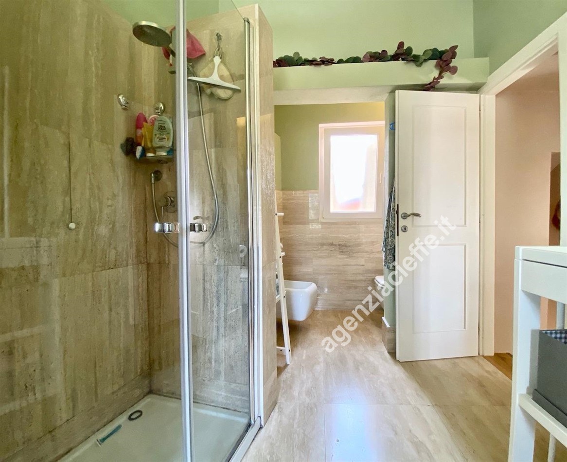 al PIANO PRIMO - in ballatoio d’ingresso, ampia zona living (circa 40 mq) dalla quale si raggiunge la cucina abitabile - che gode di una magnifica vista sul centro e sul mare - una camera ospiti/studio (15 mq circa), il bagno (con annessa zona lavanderia) ed il balcone;al PIANO SECONDO - scala di collegamento, disimpegno notte, due camere da letto matrimoniali - servite da ampio balcone vista mare - sala da bagno (con vasca, doccia e finestra).ESTERNAMENTE - gli esterni dell’immobile sono stati completamente rinnovati due anni fa, si presentano pertanto in perfette condizioni; la casa gode di una ottima esposizione al sole, presentando tre lati liberi.Dal vicolo che attraversa il borgo, si accede alla proprietà da un caratteristico androne (comodo ricovero per biciclette o scooter) e che conduce all’area esterna della casa, composta da un’ampia corte piastrellata in comune con il piano terreno.