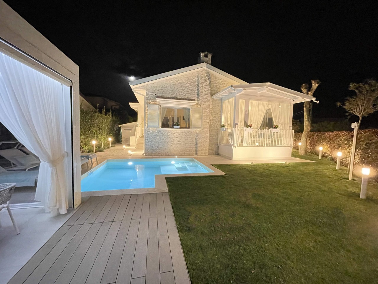Gli esterni di Villa Rossella coniugano tecnologia, grazie al Cancello carrabile con area parcheggio in grado di ospitare fino a 4 vetture, alla colonnina di ricarica per veicoli elettrici, al Sistema tagliaerba automatico con robottino comandabile anche da remoto tramite app, all' impianto di irrigazione automatica, ed all' Impianto antizanzare (Free Zanz) installato sulle siepi perimetrali comandabile sia localmente che da remoto tramite app, ed effetti scenografici, grazie ai 60 punti luce disposti anche sulla parete esterna, alla Piscina di design con 4 sedute idromassaggio e nuoto controcorrente con impianto a sale , al Solarium e doccia esterna calda/fredda e Gazebo corredato da tavolo,sofà e cucina completa a gas dotata di piano cottura, barbecue, lavello e frigo. Vano deposito rifiuti: pratico con apertura interna al giardino e ritiro esterno.