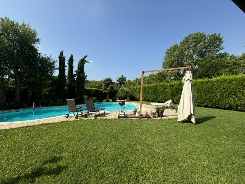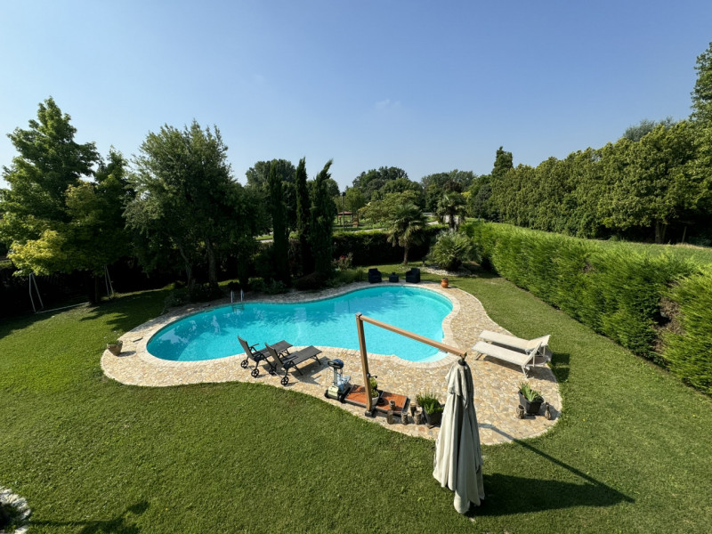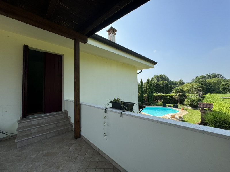 COMPOSIZIONE: Porzione di bifamiliare con curato giardino e bellissima piscina; l'abitazione presenta al piano terra ampia zona living con porticato e bagno, al piano superiore, tre camere matrimoniali, secondo bagno ed ampio terrazzo. Collegata all'abitazione, ma in corpo staccato si trovano la zona lavanderia ed il garage.