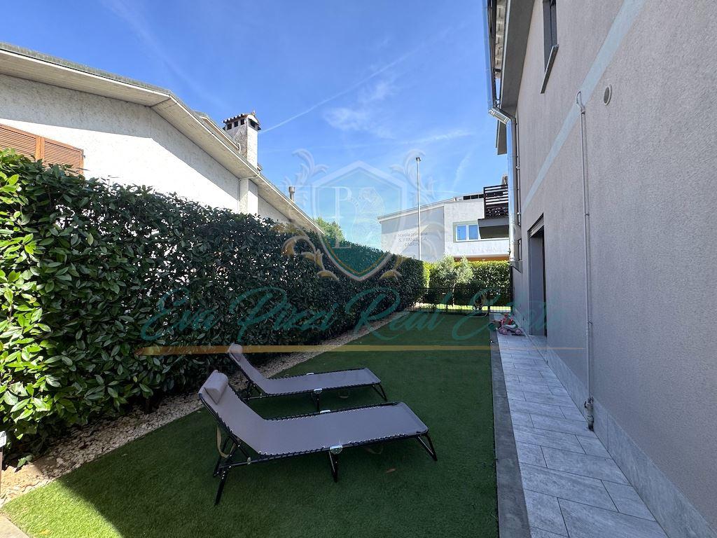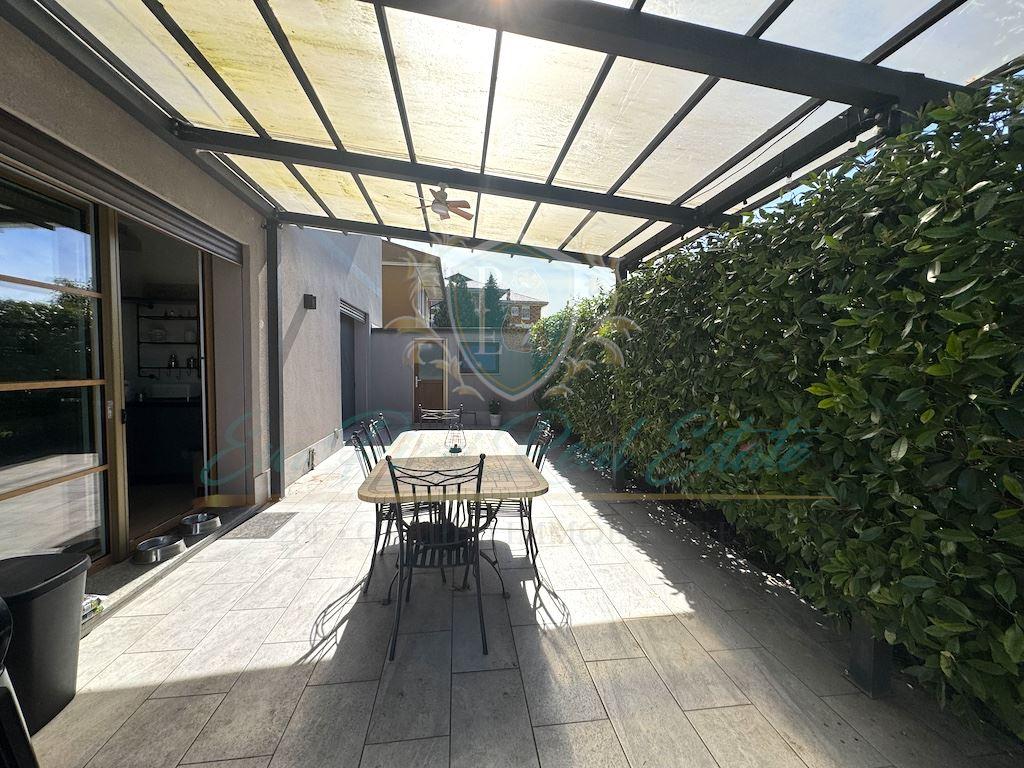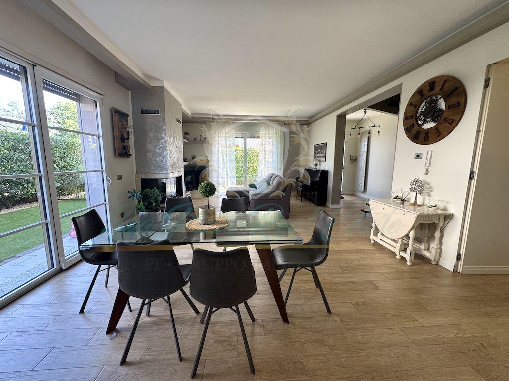 La distribuzione interna è la seguente: il Piano Terra di 110 mq ha ingresso indipendente, doppio soggiorno e cucina abitabile con accesso diretto al giardino privato su tre lati, disimpegno, bagno, camera da letto e studio; il Piano Primo di 100 mq è dotato di zona living con cucina a vista e ampio balcone, ripostiglio, camera matrimoniale con bagno en suite, disimpegno, due camere aggiuntive e secondo bagno; al Secondo e ultimo Piano di 100 mq, ulteriore zona living, cabina armadio, camera matrimoniale, bagno con vasca idromassaggio e ampio terrazzo che circonda l’intero piano. Ogni livello è dotato di zona giorno e zona notte, bagni e impianto di riscaldamento indipendente con termostato, per garantire autonomia e comfort. Finiture e dotazioni: tapparelle elettriche, impianto di allarme volumetrico, aria condizionata, 3 termostati, doppi vetri, zanzariere, caldaia a condensazione, sanitari sospesi e pavimento in gres effetto legno. Completa la proprietà un box di 29 mq con accesso da passo carraio privato e cancello elettrico. Questo immobile si distingue per la sua versatilità: una soluzione perfetta per famiglie numerose, genitori e figli che desiderano vicinanza ma anche indipendenza, oppure per chi cerca un'opportunità di investimento in ottica bifamiliare o trifamiliare. Posizione ideale per chi desidera vivere in un contesto riservato e silenzioso, ma con tutte le comodità del centro della località. Per maggiori informazioni +39 366-4461059 oppure 0371-1903125..
