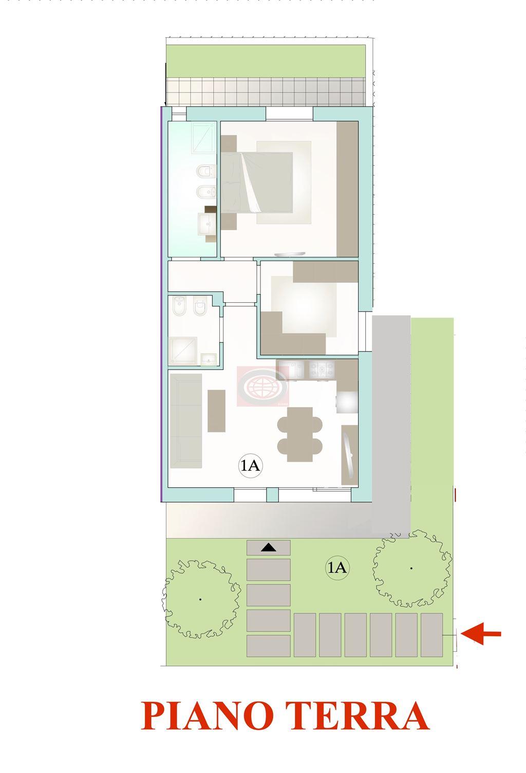 Cesena, Zona Martorano (TC1088a1) appartamento in piccola palazzina residenziale con sole 6 unità di prossima costruzione. L'appartamento è posto al piano terra con ingresso indipendente ed è composto da ingresso su soggiorno con zona cottura a vista, bagno, disimpegno, due camere da letto, secondo bagno, giardino privato di mq 60 e garage al piano interrato.
