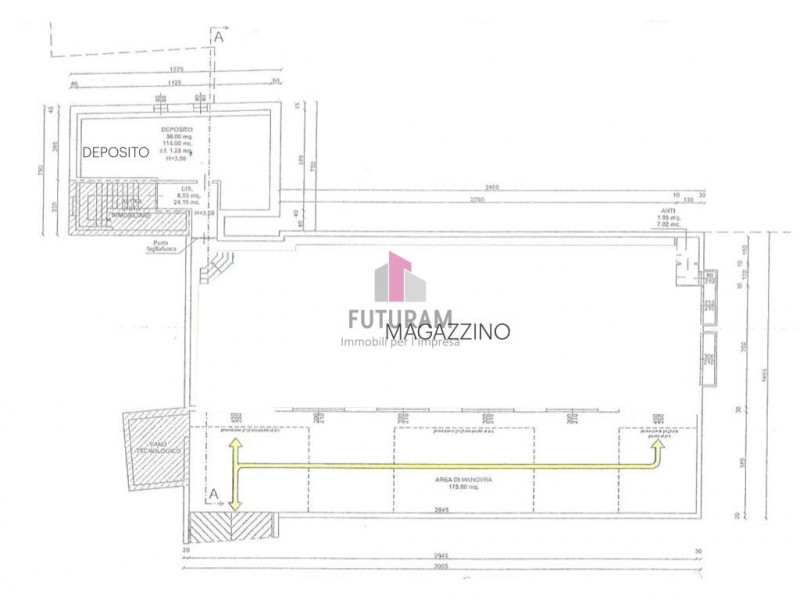 Completano l’unità una stanza di 38 mq, un disimpegno ed un servizio igienico. L’ambiente è ben tenuto e completo di impianto di illuminazione, impianto elettrico, impianto anti-incendio, riscaldamento di base e due portoni per il carico/scarico. Esterno di pertinenza per 170 mq. Comoda rampa di accesso con sbarra automatica. Libero da subito. PER PRIVACY L’INDIRIZZO RIPORTATO SU MAPPA NON CORRISPONDE ALLA REALE UBICAZIONE DELL’IMMOBILE La presente agenzia immobiliare declina qualsiasi responsabilità in ordine alle informazioni riportate in questo annuncio in quanto le stesse sono da intendersi indicative. La scrivente non assume alcuna responsabilità in ordine all’attualità delle stesse, nonché ad eventuali omissioni o inesattezze. Pertanto le informazioni riportate nel presente annuncio non costituiscono vincolo contrattuale tra le parti. --- annuncio pubblicato con GESTIONALEIMMOBILIARE.it.