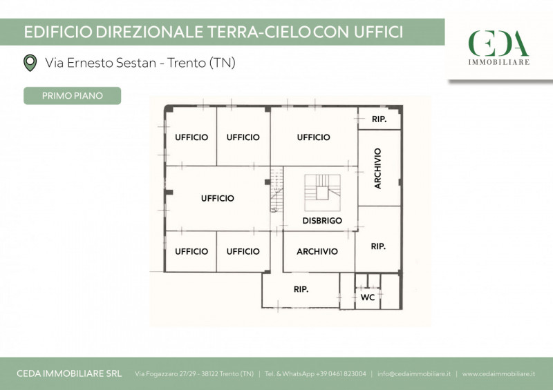 Proponiamo in vendita a Trento nella zona commerciale e direzionale di Trento Nord ufficio al primo piano di edificio commerciale composto da: ampio ingresso da piano strada con scala di accesso al primo piano, grande hall/ufficio, ufficio presidenziale con possibile archivio annesso e 7 ulteriori uffici molto spaziosi; completano il piano il bar, antibagno, doppi servizi e servizio disabili.