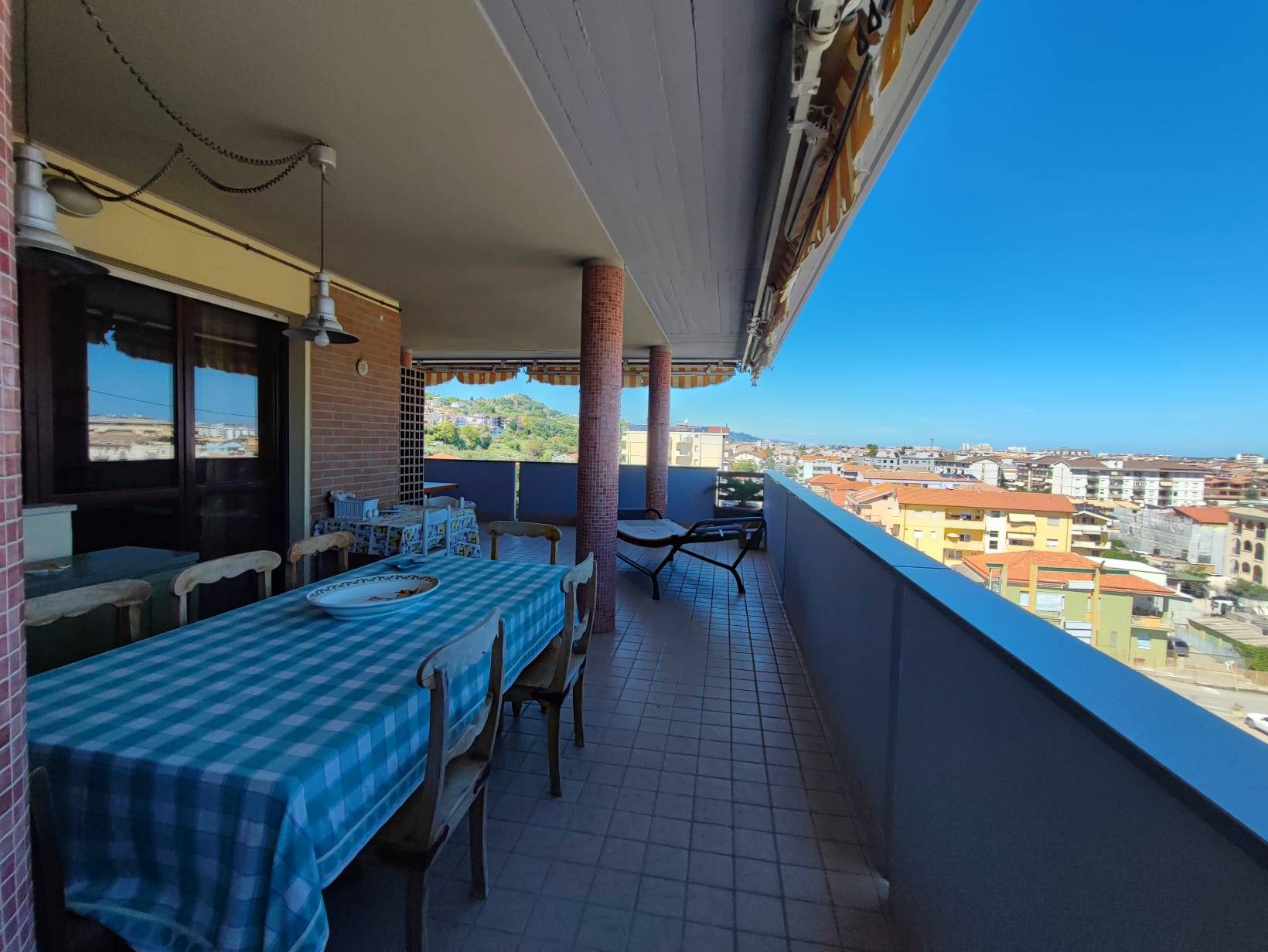 L'attico presenta una superficie interna lorda di oltre 200 mq e si sviluppa su 2 livelli. Al piano 5° abbiamo un'ampia zona living caratterizzata da grandi vetrate ed un elegante camino, una grande cucina abitabile ed un bagno con antibagno adibito a lavanderia. Un terrazzo perimetrale di circa 66 mq abbraccia l'intero living e la sua generosità di spazio permette di creare isole tematiche, come un'area relax con amache e poltrone, una zona pranzo con tavoli sedie ed una bella cucina esterna in muratura. Il piano alto e l'esposizione a nord est garantiscono una fantastica vista panoramica sul mare e sulle colline. Al piano superiore, leggermente mansardato, troviamo una camera matrimoniale con bagno privato e cabina armadio, una seconda camera matrimoniale, una cameretta, uno studio, un bagno, ed un terrazzino solarium che gode di grande privacy e di una meravigliosa vista mare. L'ampia metratura e la disposizione degli spazi permettono di creare ambienti confortevoli e funzionali, ideali per una famiglia o per chi ama avere spazio a disposizione. Gli interni sono rifiniti con materiali di alta qualità e design moderno, creando un'atmosfera elegante e raffinata. Inoltre, l'immobile dispone di un sistema di climatizzazione per garantire il massimo comfort durante le calde estati. La sua posizione privilegiata permette di godere di una vista panoramica sul mare e sulla città, offrendo un'atmosfera di relax e tranquillità. Inoltre, la vicinanza alla circonvallazione e ai servizi principali rende la zona molto comoda e funzionale per la vita quotidiana. Completano la proprietà un ampio garage di circa 30 mq ed un posto all'interno della corte condominiale. In sintesi, questo attico in vendita a Montesilvano è la scelta ideale per chi cerca una casa prestigiosa e di alta qualità, con ampi spazi e una vista mozzafiato sul mare. Non esitate a contattarci per maggiori informazioni e per organizzare una visita..