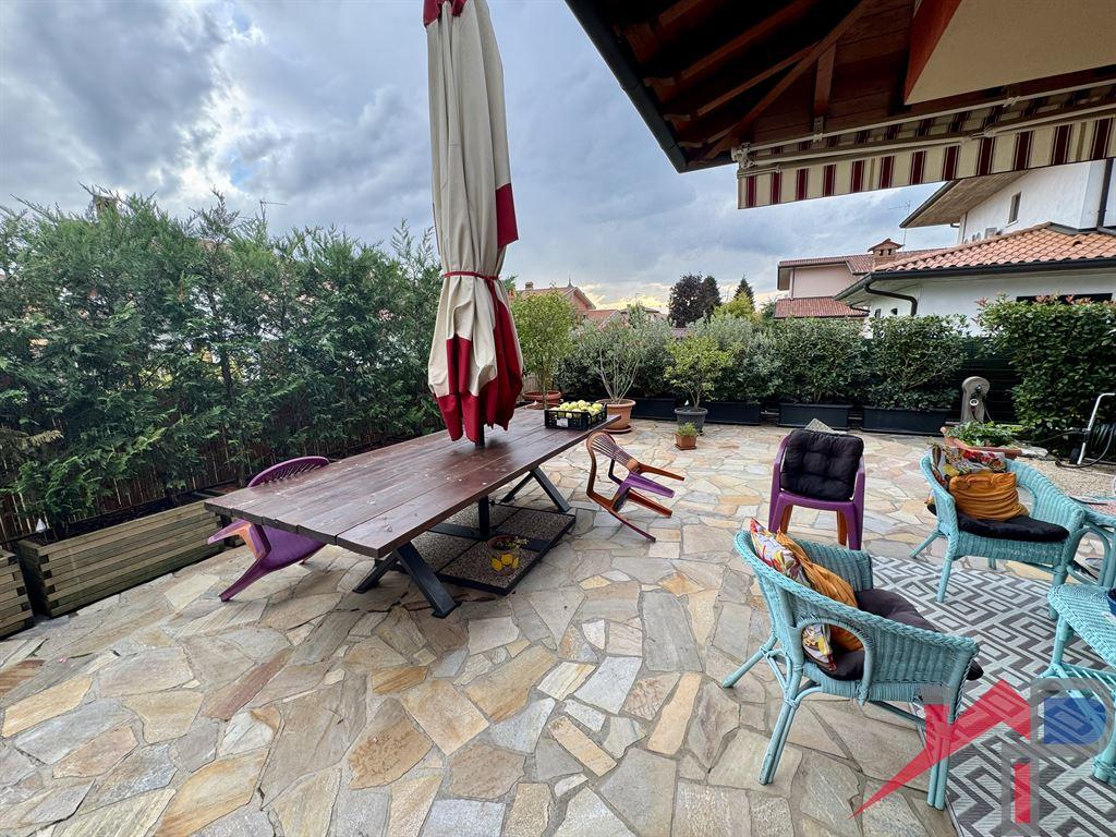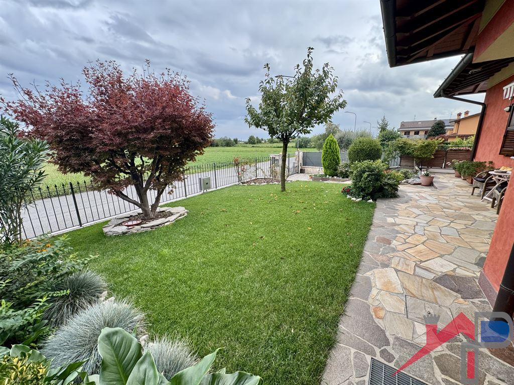 Mornico Al Serio in zona residenziale verde e tranquilla del paese, ma comunque posizionata a pochi passi dal centro paese e da tutti i suoi servizi raggiungibili a piedi, si propone una porzione di villa bifamiliare di recente costruzione tenuta in eccellente stato di manutenzione, la villa gode di ottima indipendenza infatti é dotata di accessi sia carrale che pedonale indipendenti; L'abitazione principale disposta su unico piano é composta da ingresso, soggiorno con cucina abitabile aperta, disimpegno, 2 ampie camere letto, bagno, scala di accesso al piano seminterrato dove troviamo un ampio locale pluriuso (potrebbe diventare 3a camera in quanto dotata di porta finestra per luce/aria, una grande taverna con cucina, cantina e ampio bagno/lavanderia, ampia autorimessa il giardino privato su 3 lati molto curato dispone di una zona pranzo /barbecue esterna e consente anche l'eventuale posizionamento di una piscina.