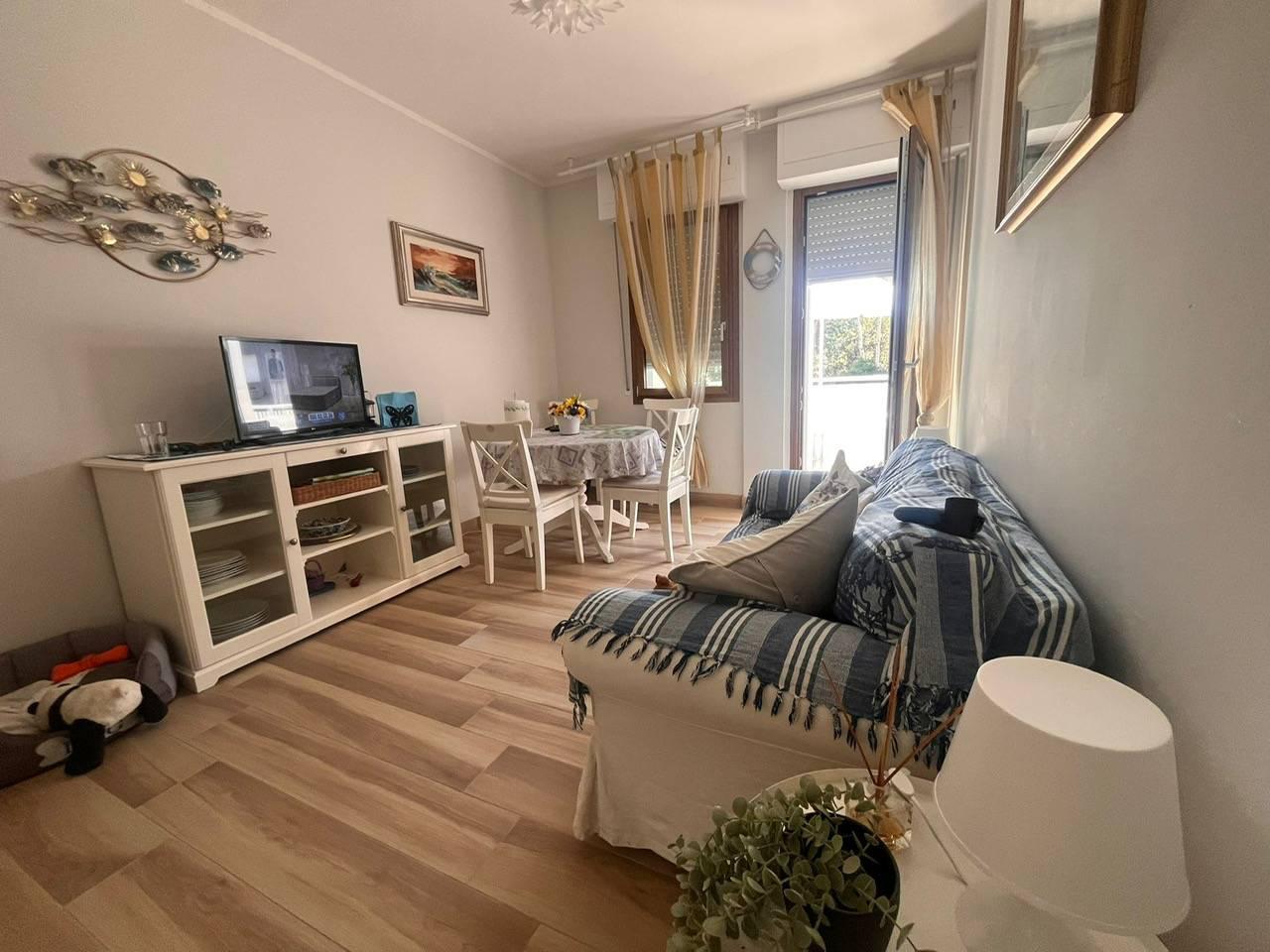 Lâ??immobile si compone di: Ampio ingresso con armadiatura a muro, soggiorno accogliente con zona pranzo, cucina separata funzionale e ben organizzata, due stanze, bagno finestrato con doccia, un terrazzo con accesso dal soggiorno ed un altro ampio terrazzo ad angolo con vista sul mare con accesso dalla camera, ideale per momenti di relax allâ??aperto. Completa la proprietà un comodo posto auto coperto, elemento raro e molto apprezzato in zona. Oltre all'appartamento anche il condominio ha subito recentemente un radicale intervento di ristrutturazione con Superbonus 110%. La posizione è ottimale: a pochi minuti dalla spiaggia, ben servita ma al tempo stesso immersa nella tranquillità della pineta. Ideale sia come casa vacanze o investimento per locazioni turistiche..