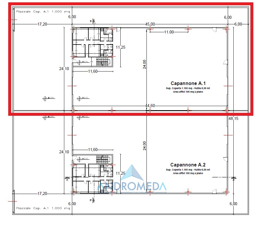 Piano terra di circa m² 1.100, con altezza di mt 10,15 al colmo e sotto trave di mt 8,50, di cui m² 100 destinati ad uffici, con altezza di mt 3,00;Primo piano soppalcato di circa m² 100, anch’esso adibito ad uso ufficio, con altezza di mt 3,00.