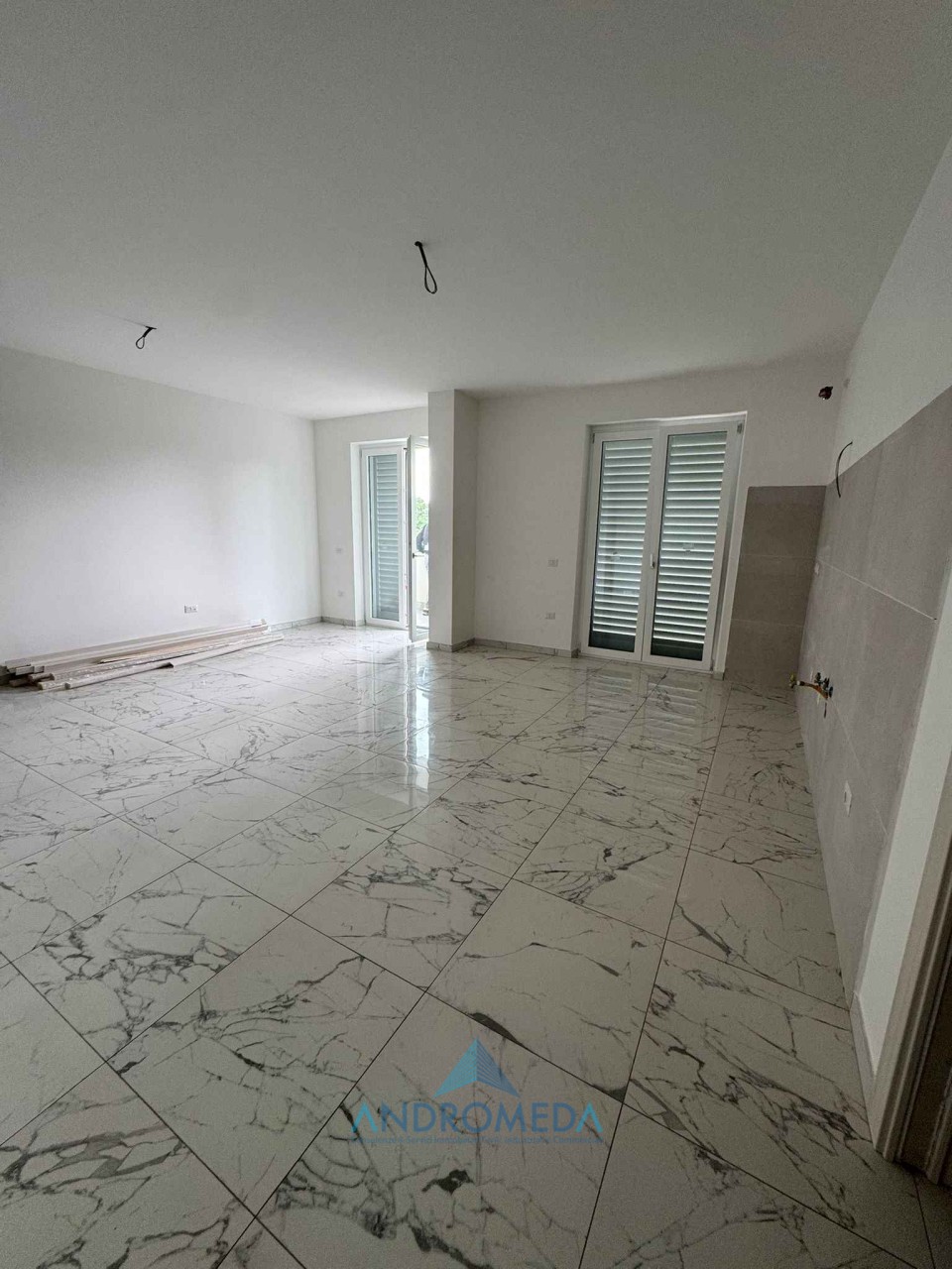 L’ appartamento si compone di: ingresso, ampio salone living con cucina a vista, due camere da letto, di cui una con bagno privato, un ulteriore bagno di servizio e un ampio ripostiglio/lavanderia.