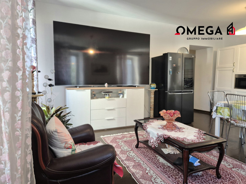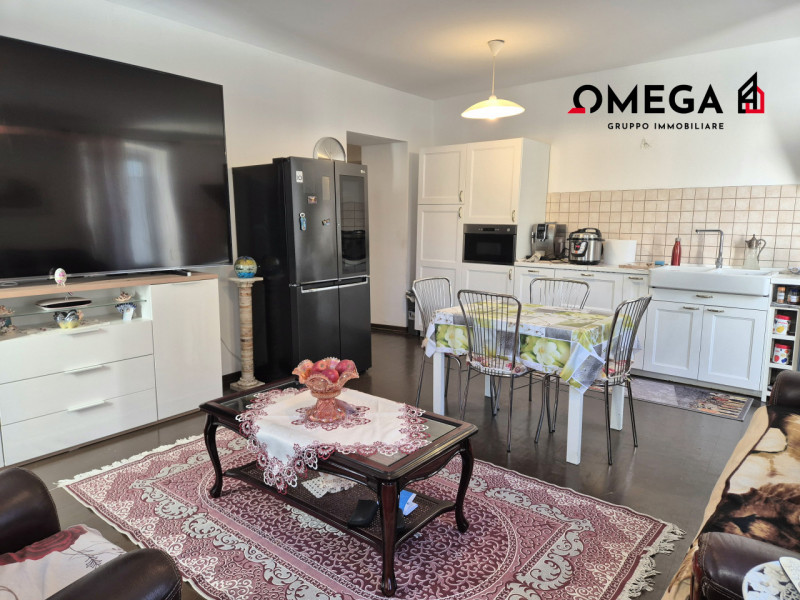 Appartamento tricamere: corridoio d'ingresso, grande soggiorno ad angolo con 4 finestre e angolo cottura, due camere matrimoniali, camera singola, bagno e ripostiglio/lavanderia. Gli infissi sono in PVC bianco e le porte interne sono in legno bianco.