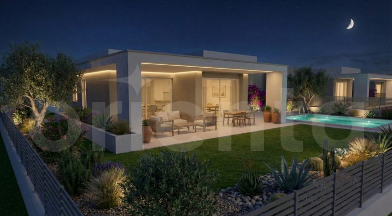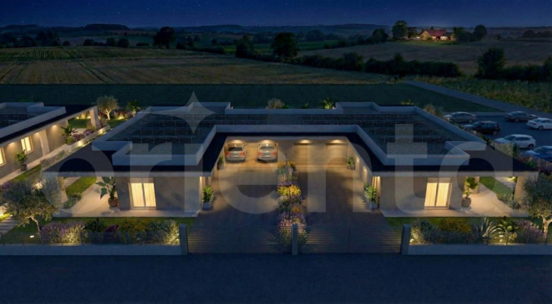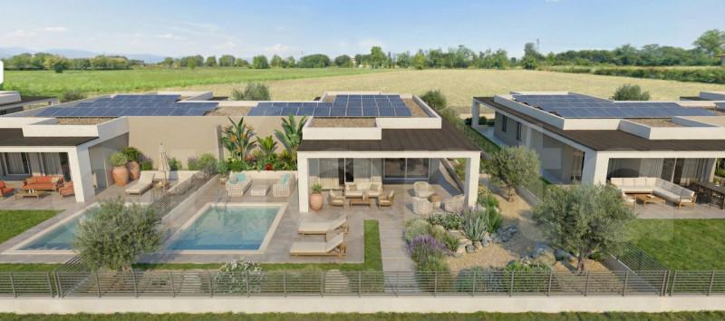 A Lonato del Garda, in una delle aree più verdi, riservate e ricercate della provincia di Brescia, prende forma un esclusivo intervento residenziale composto da sole 7 ville singole indipendenti, progettate secondo i più avanzati standard NZEB – Nearly Zero Energy Building. ARCHITETTURA E SPAZI Le ville si distinguono per un design architettonico moderno, pulito ed elegante, caratterizzato da volumi equilibrati, grandi superfici vetrate e materiali contemporanei di alta qualità. Ogni abitazione è completamente sviluppata su un unico piano, scelta progettuale che garantisce massima funzionalità, comfort abitativo e assenza di barriere architettoniche. La zona giorno è ampia, luminosa e scenografica: le grandi vetrate scorrevoli mettono in perfetta continuità interno ed esterno, affacciandosi sul portico coperto arredabile e sul giardino privato. La zona notte ospita: tre camere da letto matrimoniali, doppi servizi moderni, lavanderia separata. Completa la proprietà un garage doppio affiancato, con predisposizione per la ricarica di veicoli elettrici, in linea con la filosofia sostenibile del progetto. SPAZIO OUTDOOR: IL VERO VALORE AGGIUNTO Il fulcro di ogni villa è rappresentato dall’ampio giardino privato piantumato, studiato per offrire privacy, relax e vivibilità durante tutto l’anno. È prevista la possibilità di realizzare una piscina privata opzionale, ideale per momenti di benessere e convivialità, valorizzata da: illuminazione scenografica integrata nel verde, spazi esterni progettati per vivere anche le ore serali. 000 TECNOLOGIA E SOSTENIBILITÀ – STANDARD NZEB Il progetto nasce secondo i criteri NZEB (Nearly Zero Energy Building), ovvero edifici a fabbisogno energetico quasi nullo, in cui la maggior parte dell’energia necessaria è prodotta da fonti rinnovabili. In concreto, questo significa: impianto fotovoltaico ad alta efficienza installato su tetto piano, pompa di calore per riscaldamento invernale e raffrescamento estivo, isolamento termoacustico avanzato dell’involucro edilizio, serramenti performanti di ultima generazione, consumi energetici ridottissimi e assenza totale di spese condominiali.