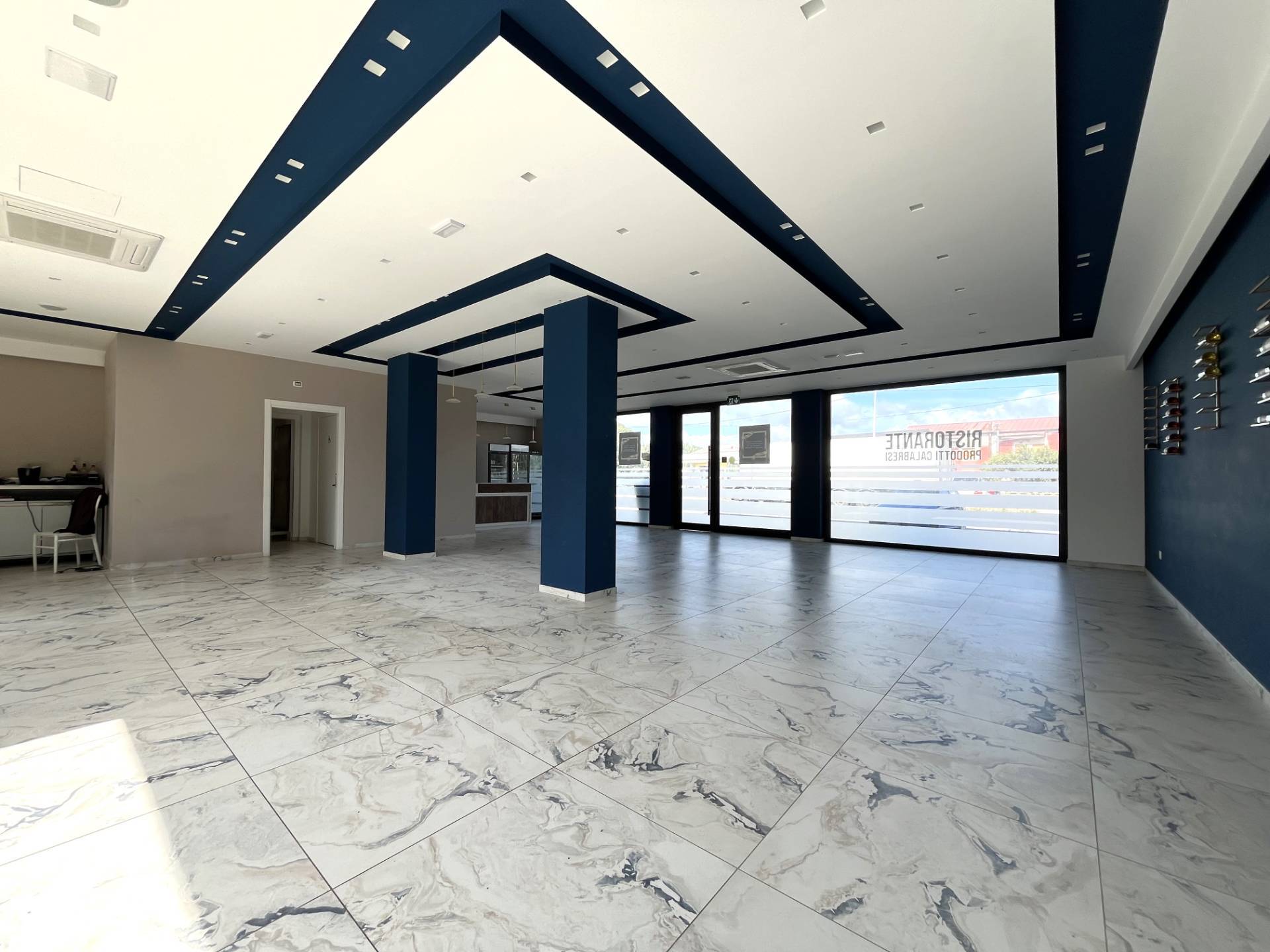 Roccelletta di Borgia, in zona commerciale ad alto transito veicolare sulla S. S. All'interno è composto da area vendita open space con bagno e anti bagno. Dotato di illuminazione a led e impianto climatizzazione.
